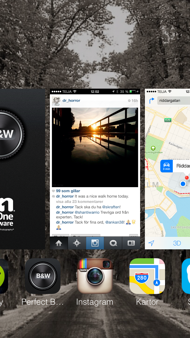 What is really nice in the new iOS is the multi tasking screen where you can reach all apps that currently are running. This screen is now a full screen with “live shots” from each and every app running. Great GUI!